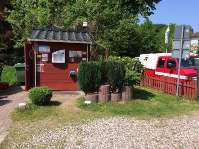 An diesem Haus kann man bezahlen, Wasser tanken und die Toilettenbox entsorgen